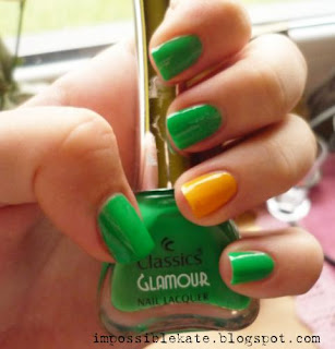 Tutaj frencz wykonany zestawem Sally Hanson, jednak nigdy wcześniej tego nie robiłam, i nie jestem zadowolona z efektu. Na dodatek moje paznokcie są przebarwione od zielonego lakieru i nie zbyt dobrze to wygląda..